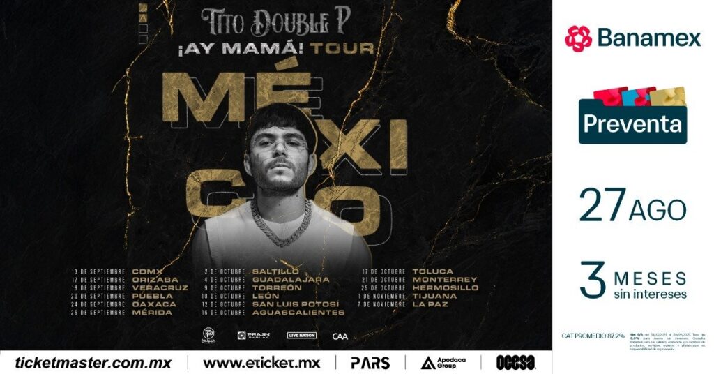 El huracán de Tito Double P finalmente aterriza en México. Tras conquistar Estados Unidos con una gira de 27 conciertos completamente agotados, el cantante y compositor sinaloense anuncia oficialmente el arranque de la etapa mexicana de su tour ¡Ay Mamá!, que recorrerá 17 ciudades del país entre septiembre y noviembre de 2025. La gira está producida por Live Nation y OCESA, y promete noches electrizantes con el repertorio que ha colocado a Tito en la cima de la música mexicana contemporánea.